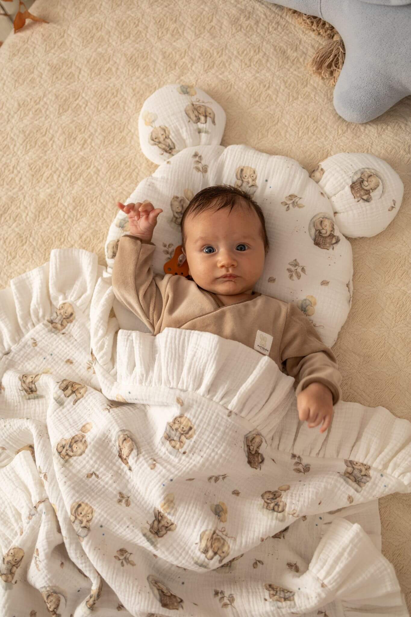Copertina in mussola per neonati (quattro strati) / fascia double-face con volant Elefanti