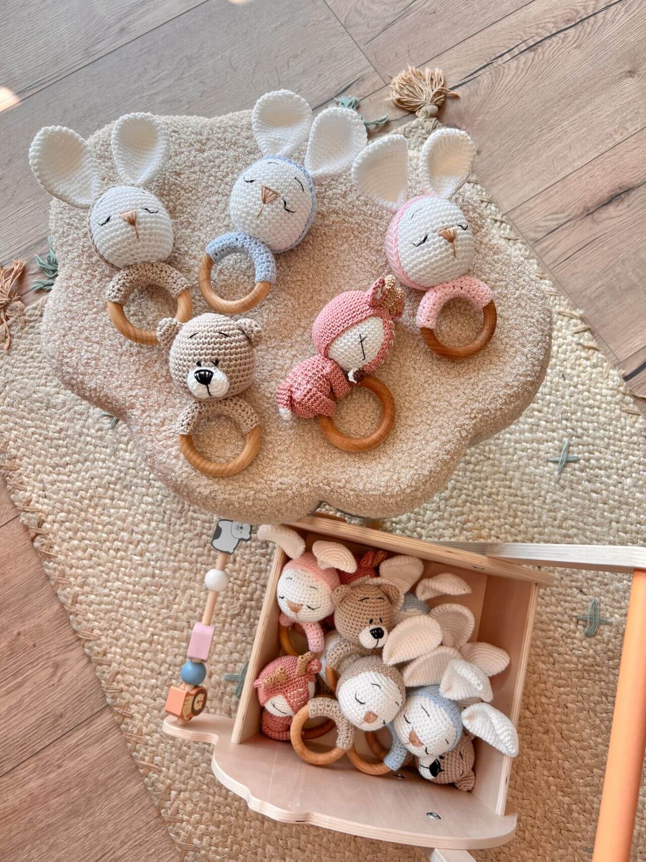 Sonaglio da dentizione (decorativo) 2 in 1 renna rosa intrecciata a mano