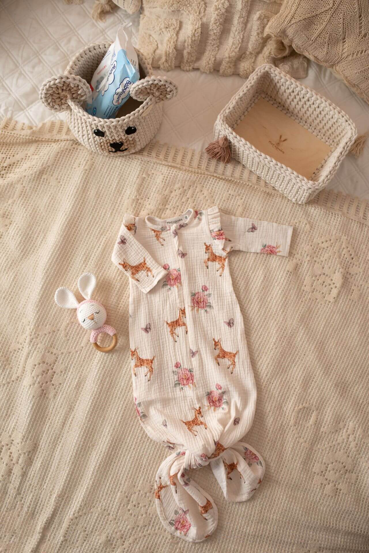 Tutina per neonato (sacco nanna) in mussola capriolo con coda