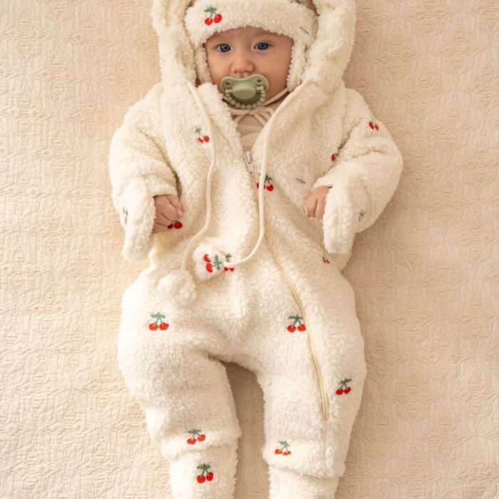 Kombinezon niemowlęcy pluszowy baranek Wisienki | Jesienno-zimowy z zakrytymi łapkami i stópkami