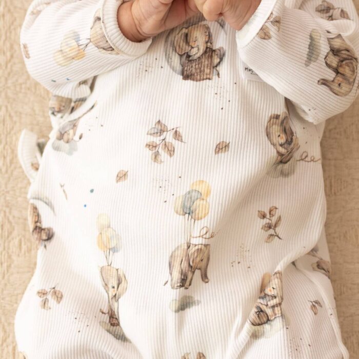 Zakres cen: od 149,00 zł do 159,00 złRampers niemowlęcy kopertowy – prążkowana bawełna Słoniki