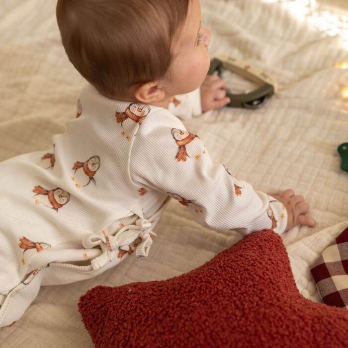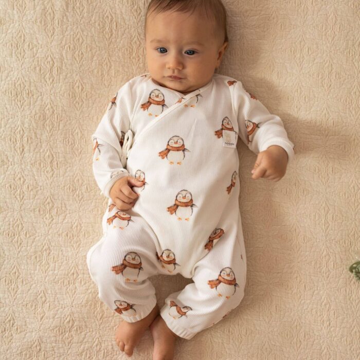 Zakres cen: od 149,00 zł do 159,00 złRampers niemowlęcy kopertowy – prążkowana bawełna Pingwinki
