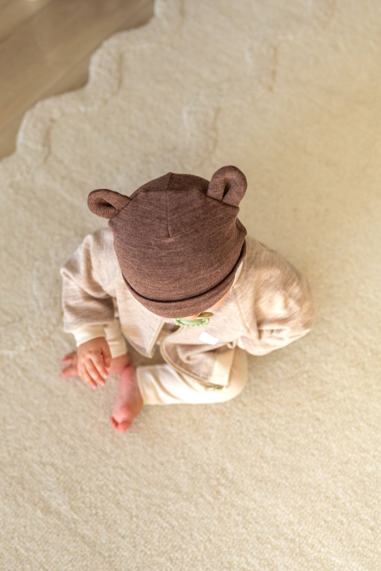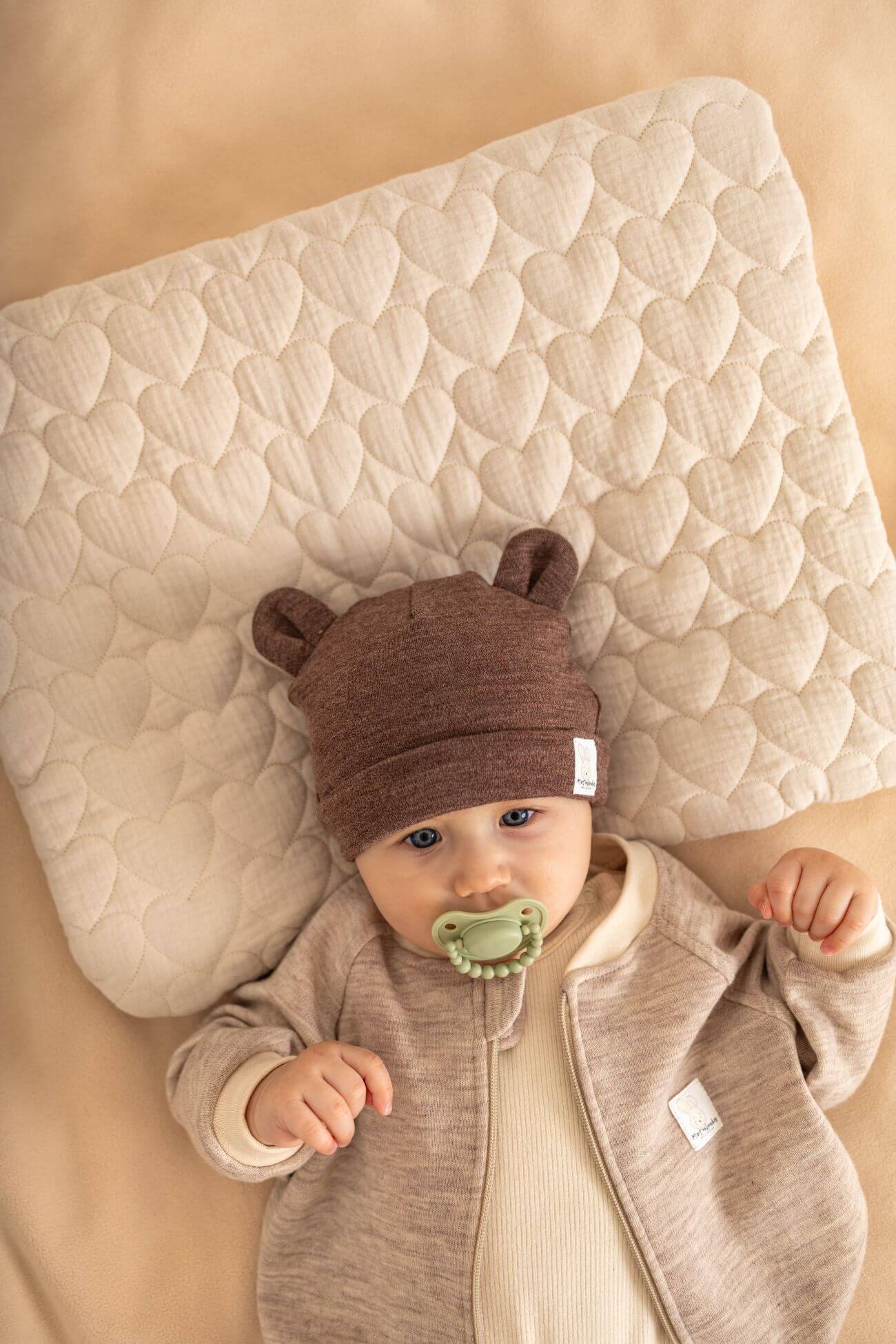 Czapeczka niemowlęca z dzianinowej wełny merino. Naturalnie oddychająca i termoregulacyjna, zapewnia komfort bez przegrzewania, delikatnie chroniąc główkę dziecka w zmiennych warunkach pogodowych. Miękka, elastyczna i bezpieczna.