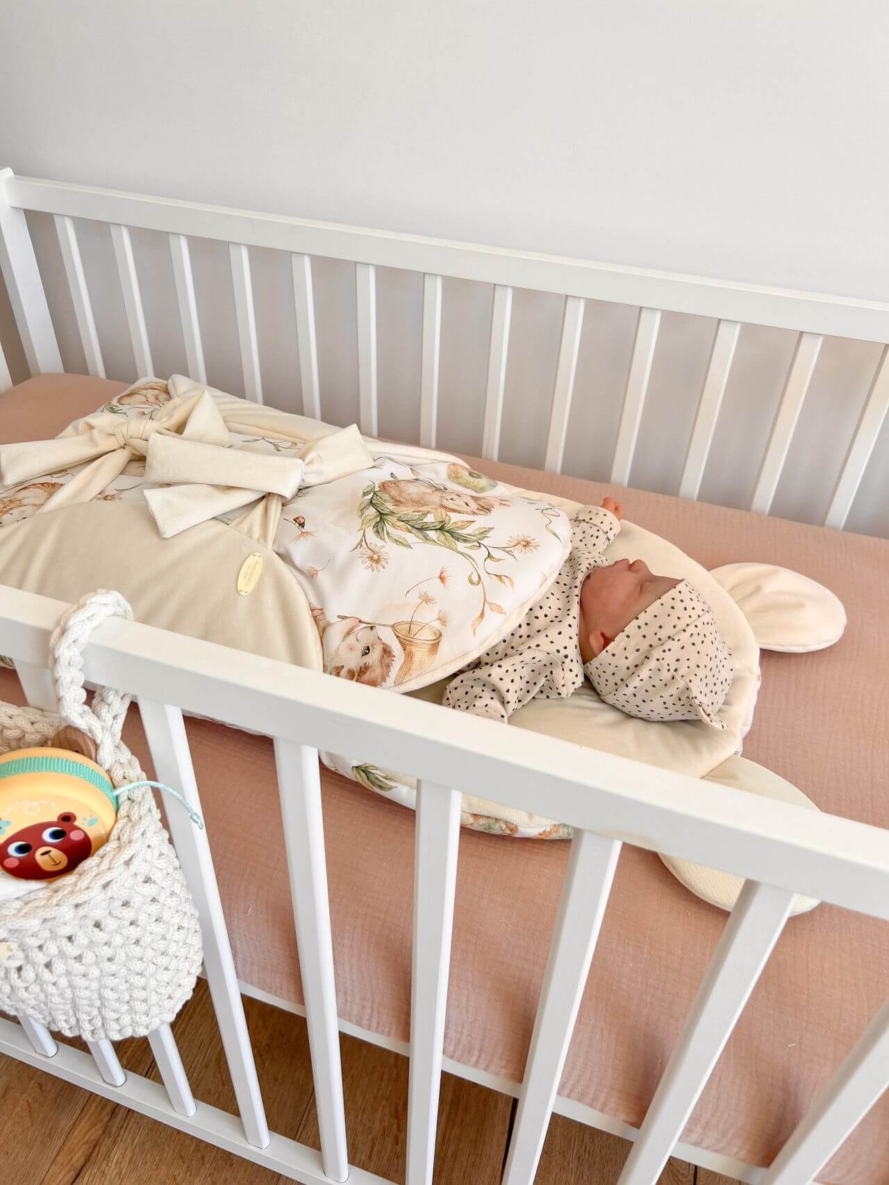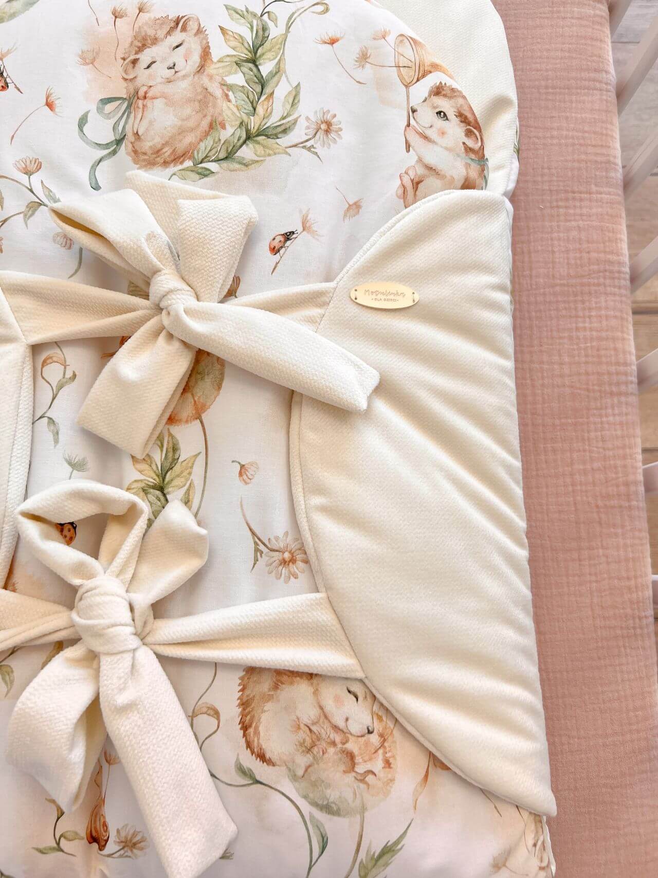 Materiał: Nasz becik został wykonany z mięciutkiego, przyjemngo valvetu, oraz najwyższej jakości bawełny premium. Materiały są bardzo delikatne dla skóry dziecka i zapewniają miły sen dla maluszka.