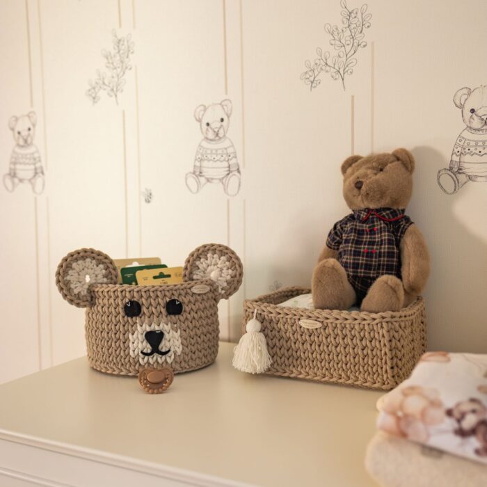 Koszyczek organizer do pokoju dziecięcego ręcznie pleciony – (miś, prostokąt) latte