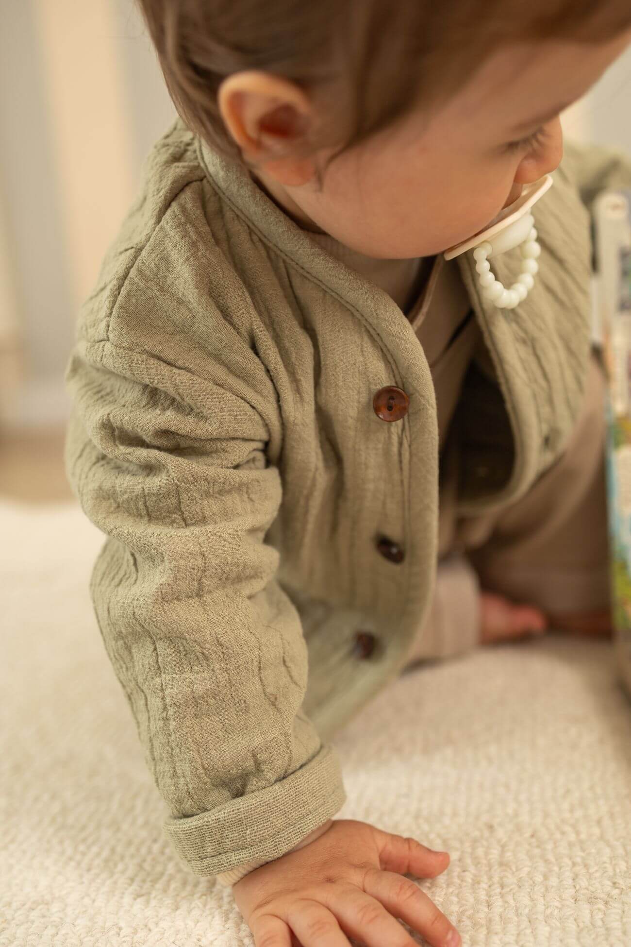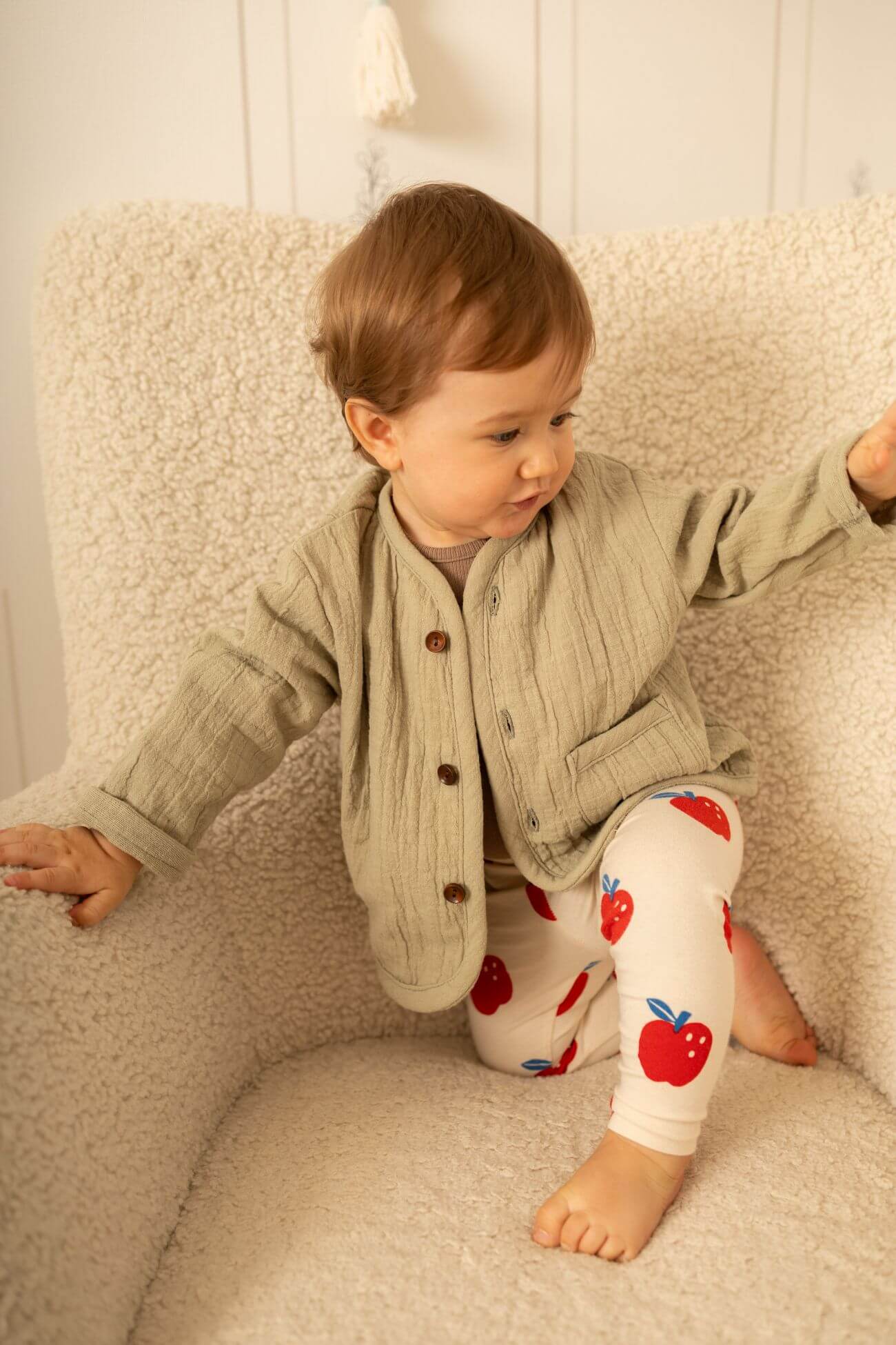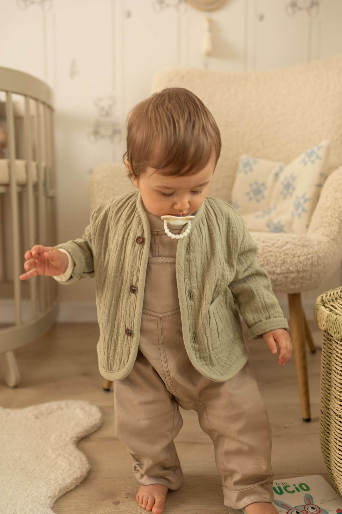 Krój i naturalna struktura muślinu sprawiają, że kurteczka wygląda lekko i stylowo. To uniwersalne ubranko, które pasuje do wielu stylizacji i nie wychodzi z mody.