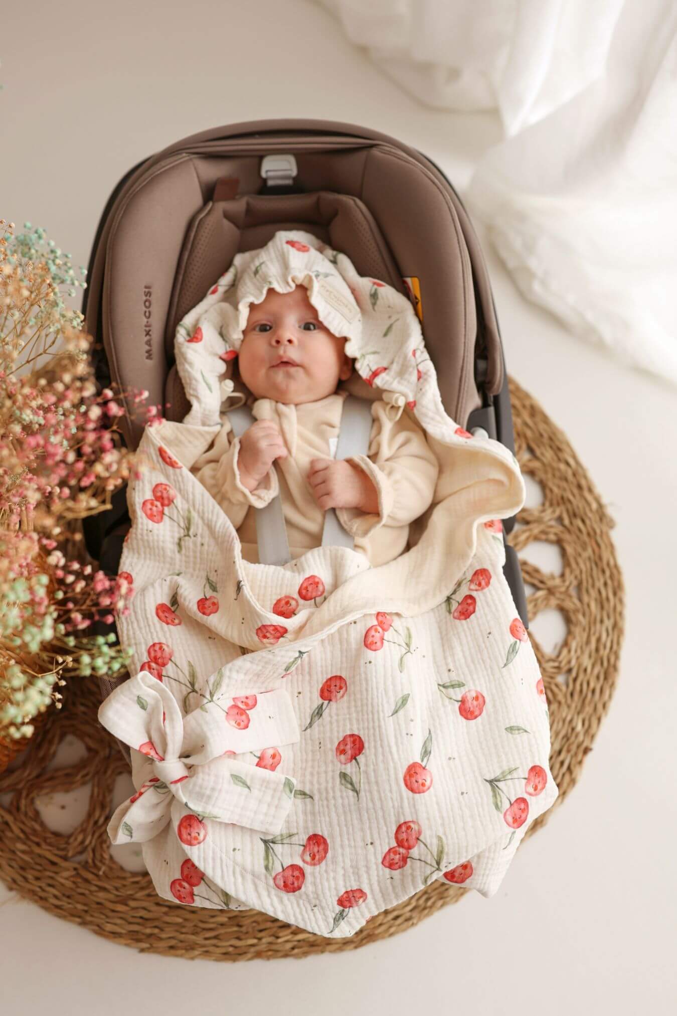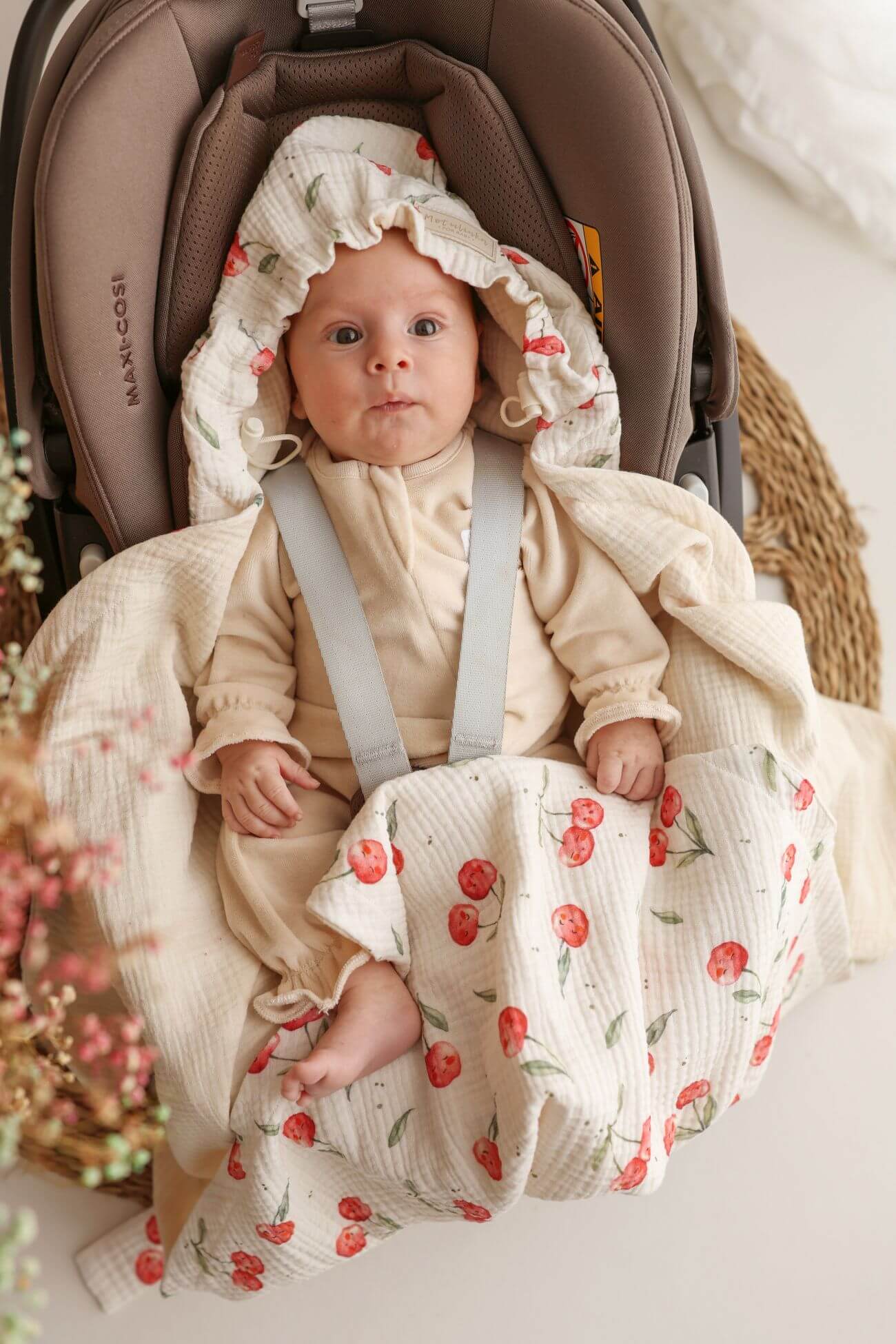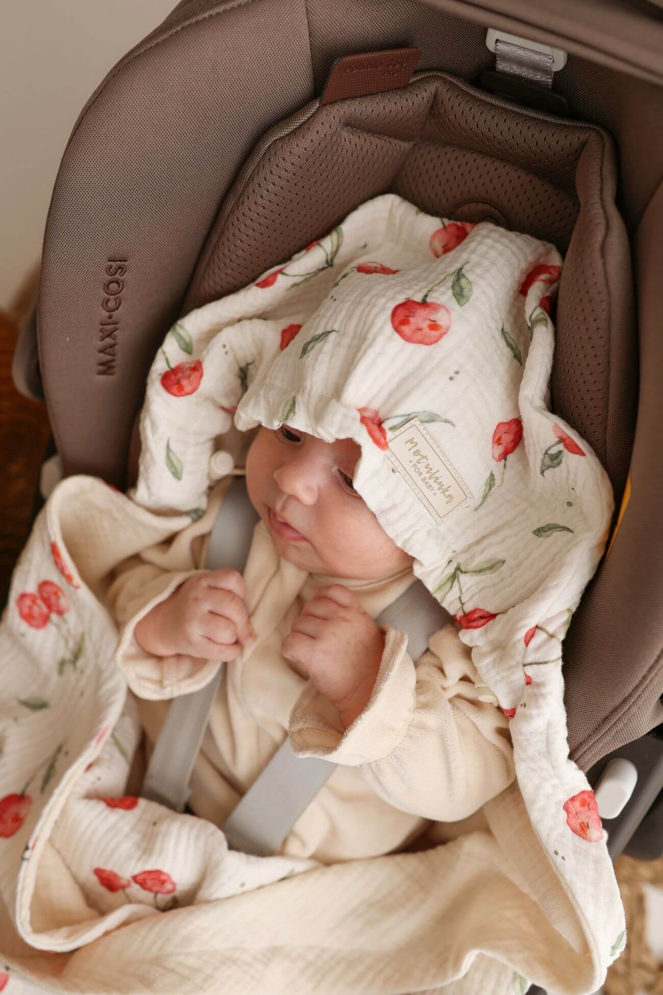 Letni otulacz do fotelika muślinowy premium Słoneczne owocki – wisienki natural