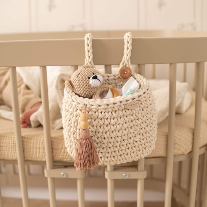 Organizer wykonany ręcznie na szydełku ze sznurka bawełnianego, stworzony z myślą o ułatwieniu codziennej pielęgnacji Twojego maluszka. Można go łatwo zawiesić na łóżeczku lub innym meblu, zapewniając szybki dostęp do wszystkich niezbędnych akcesoriów pielęgnacyjnych (np. pieluszki, kremy, balsamy).
