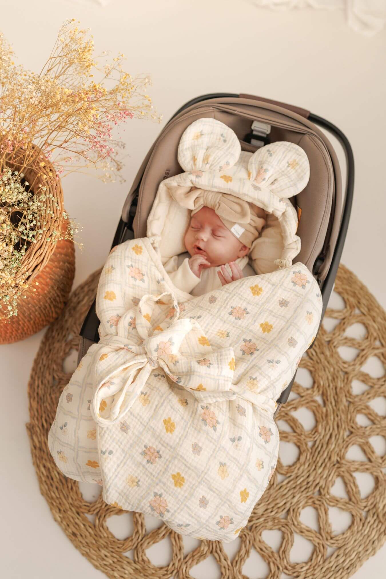 Otulacz do fotelika muślinowy premium Kwiatuszki w kratce – natural