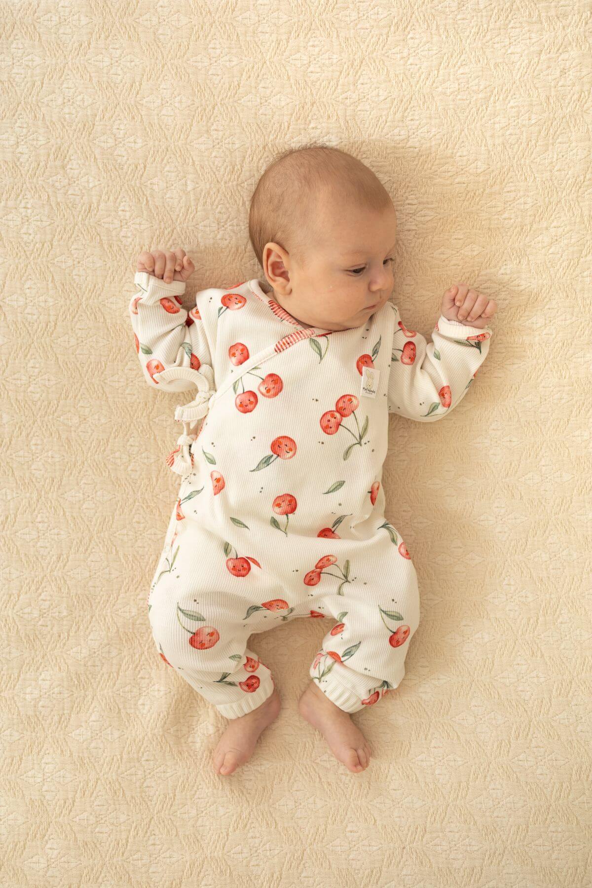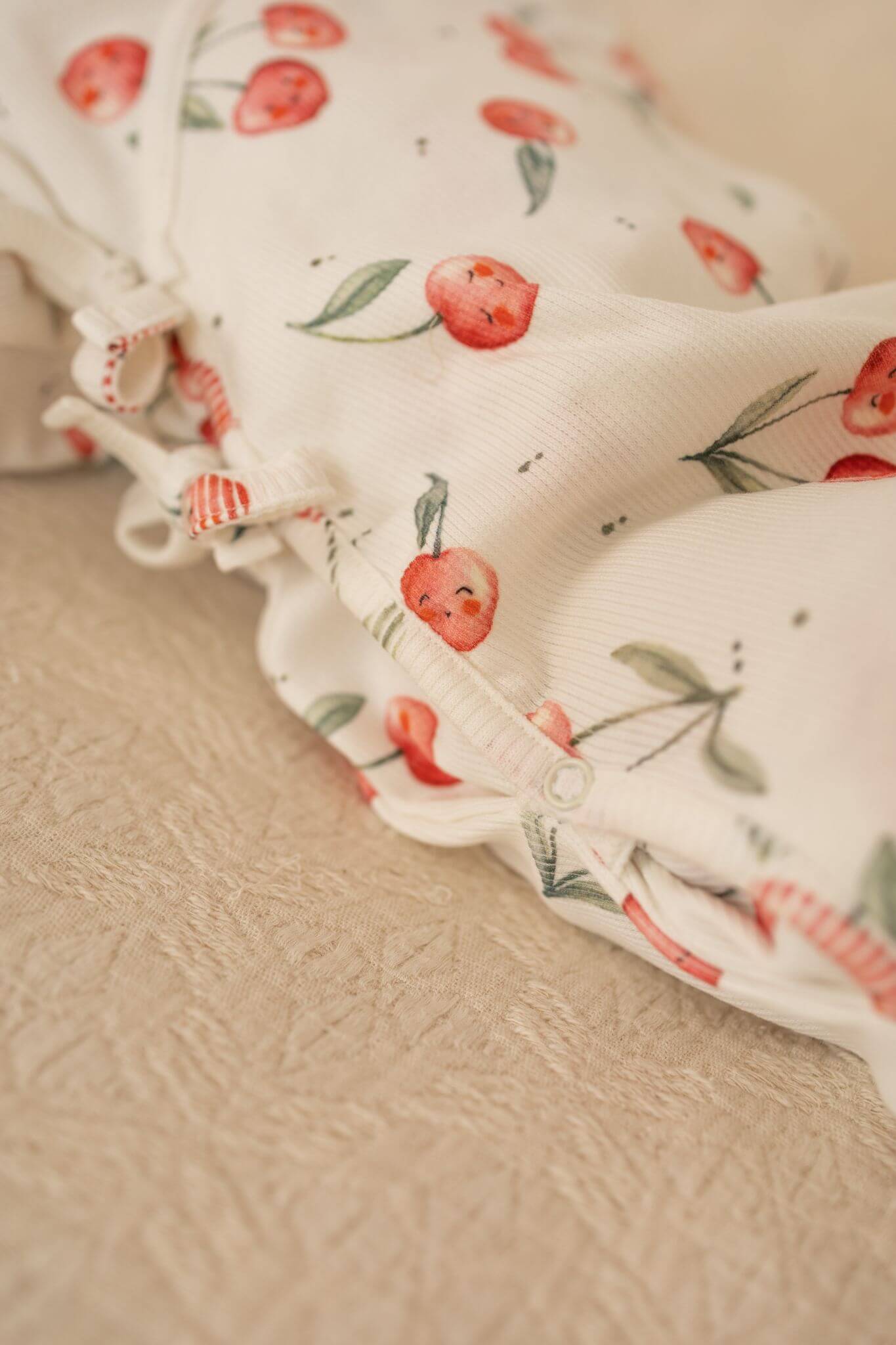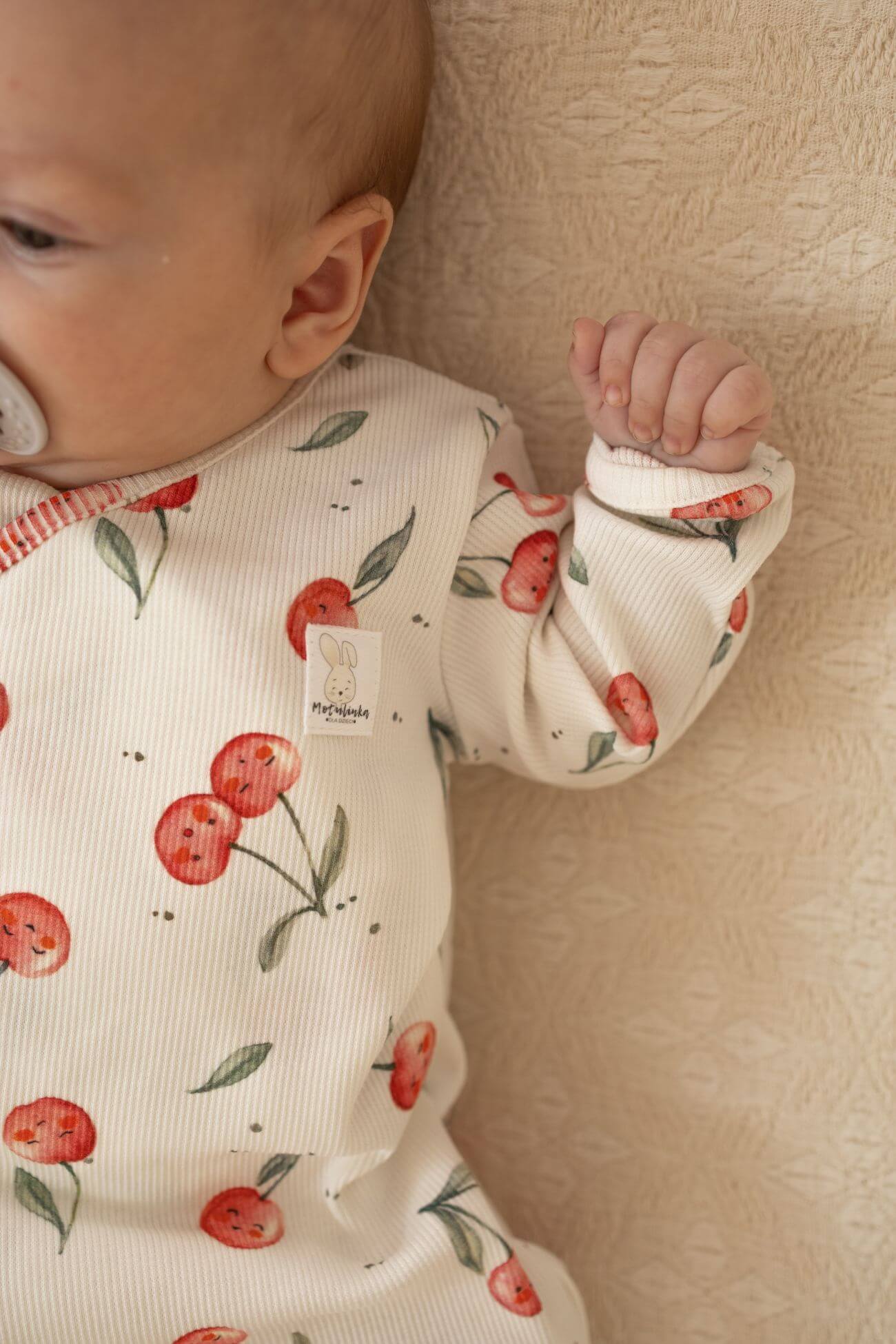 Rampers niemowlęcy kopertowy – prążkowana bawełna Słoneczne owocki – wisienki