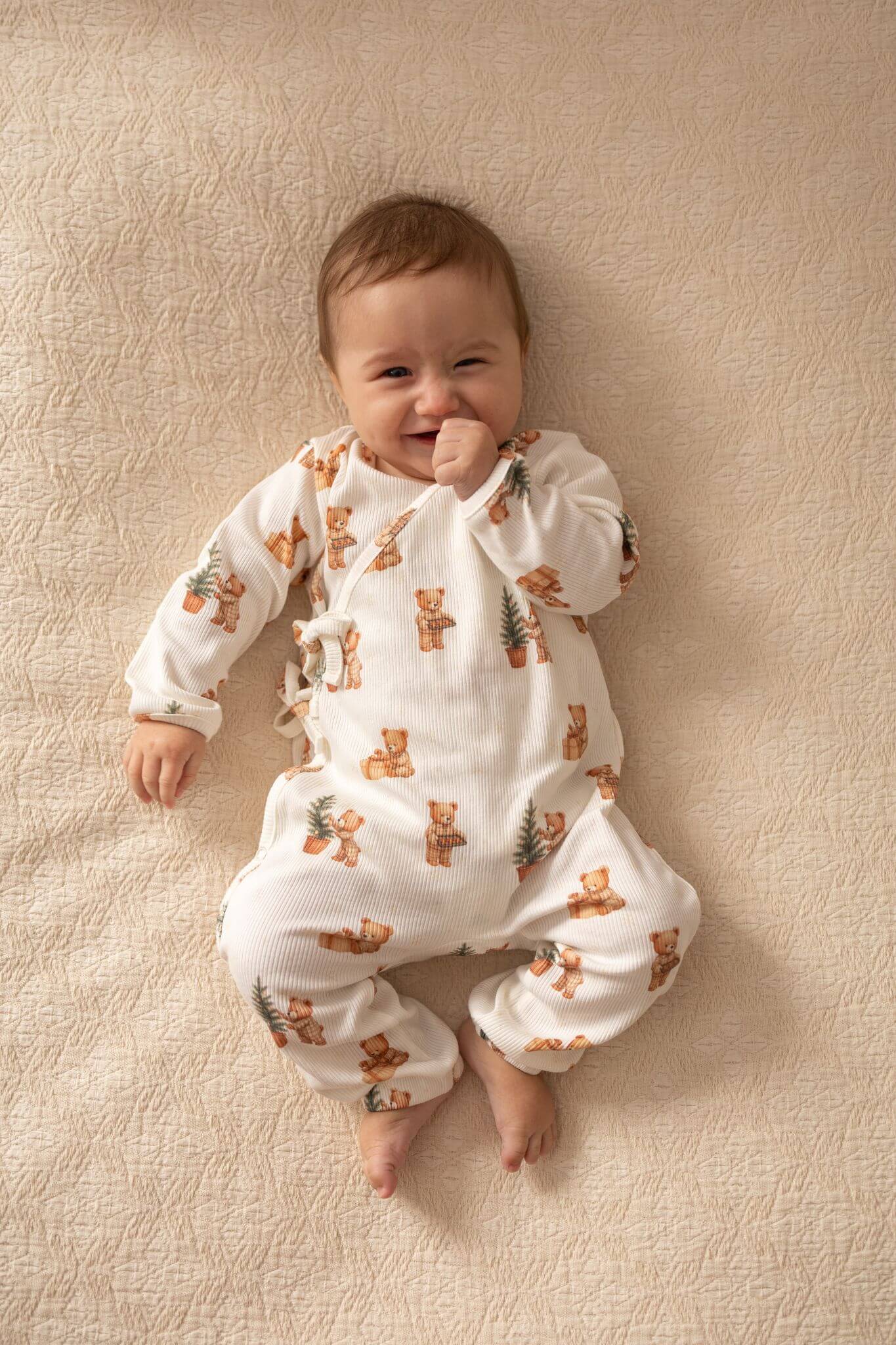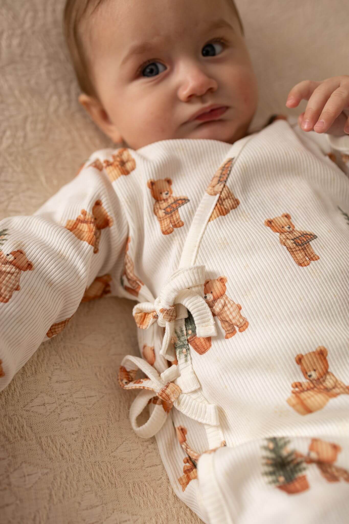 Rampers niemowlęcy kopertowy – prążkowana bawełna Świąteczne misie