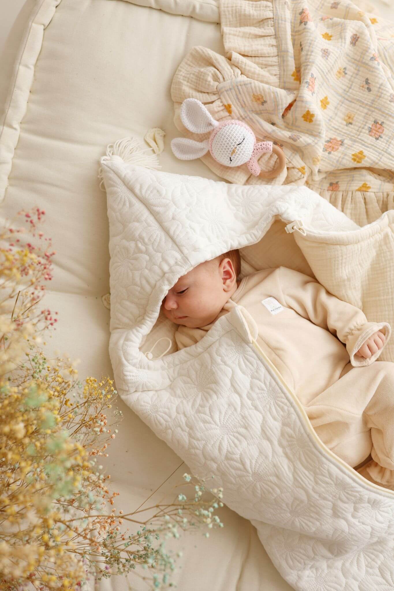 Śpiworek muślinowy do gondoli i fotelika wiosenno-letni dla niemowląt pikowane kwiatuszki – śmietankowe