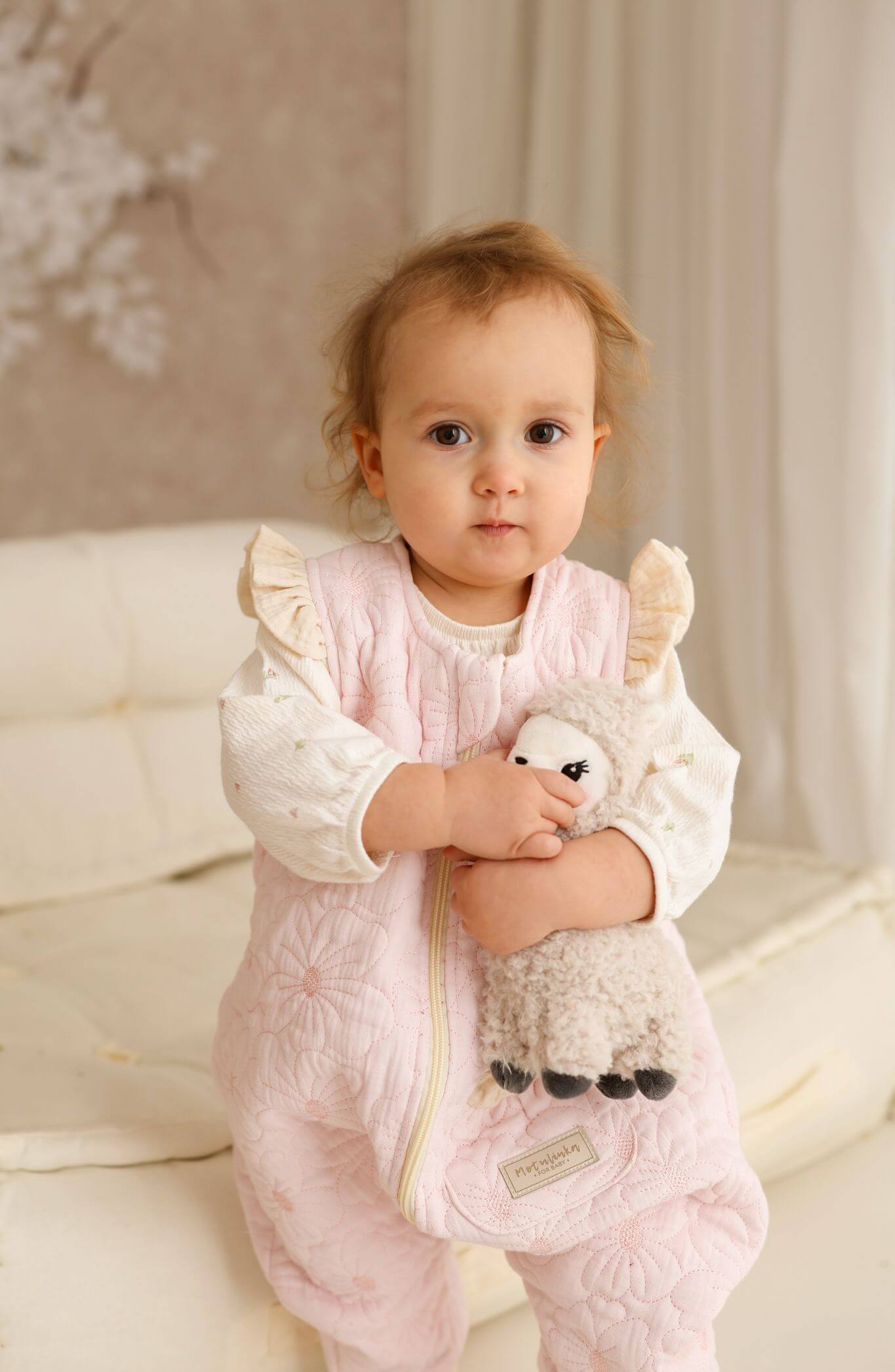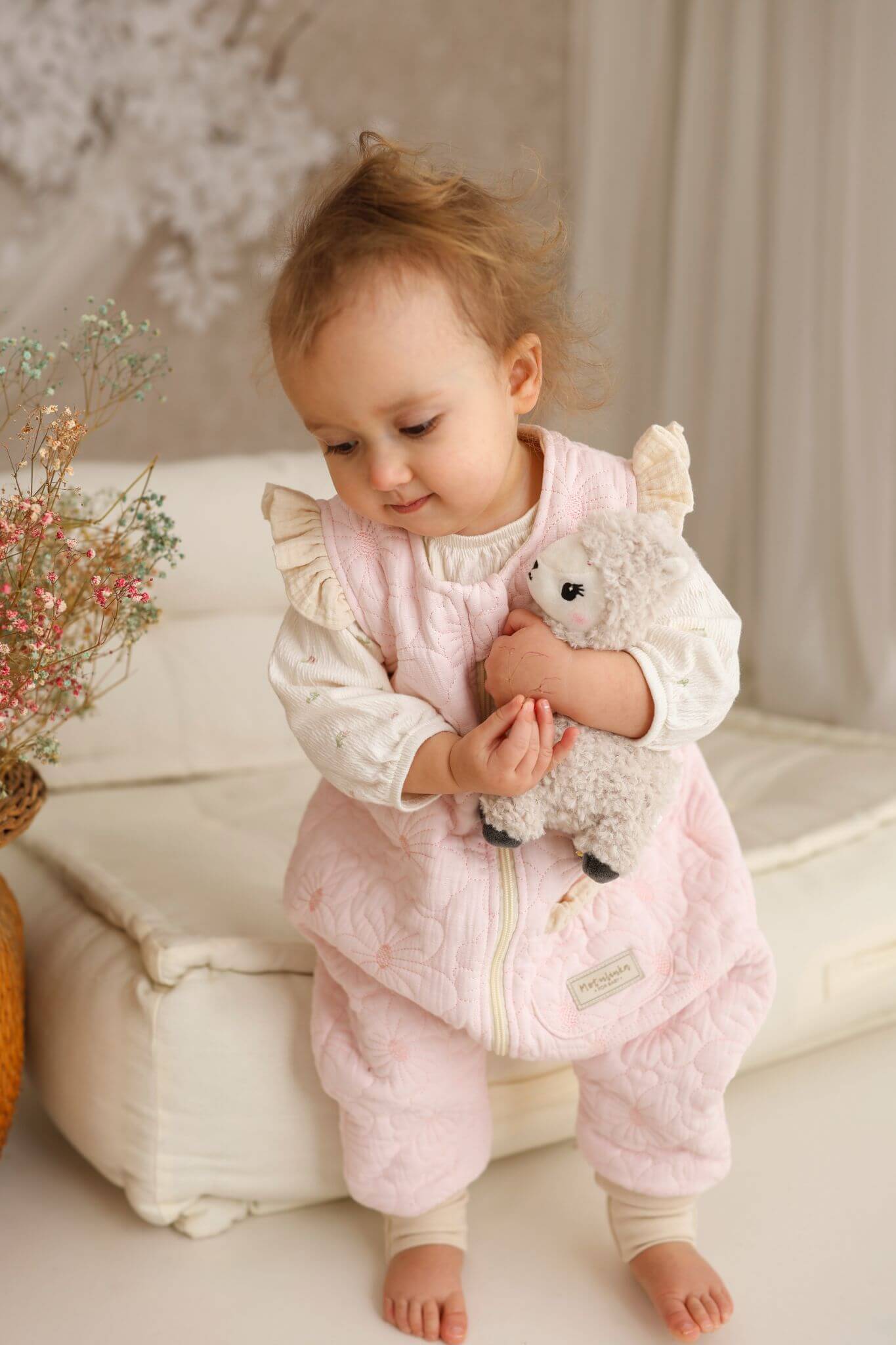 Śpiworek wykonany jest z wysokiej jakości, miękkiego muślinu bawełnianego. Z zewnątrz zastosowano pikowany muślin z certyfikatem OEKO-TEX® Standard 100, który nadaje całości elegancki wygląd i zwiększa trwałość. Wewnątrz znajduje się certyfikowany, delikatny muślin, przyjemny w dotyku i bezpieczny dla wrażliwej skóry dziecka. Tkaniny są oddychające i zapewniają odpowiednią cyrkulację powietrza, wspierając komfort snu.