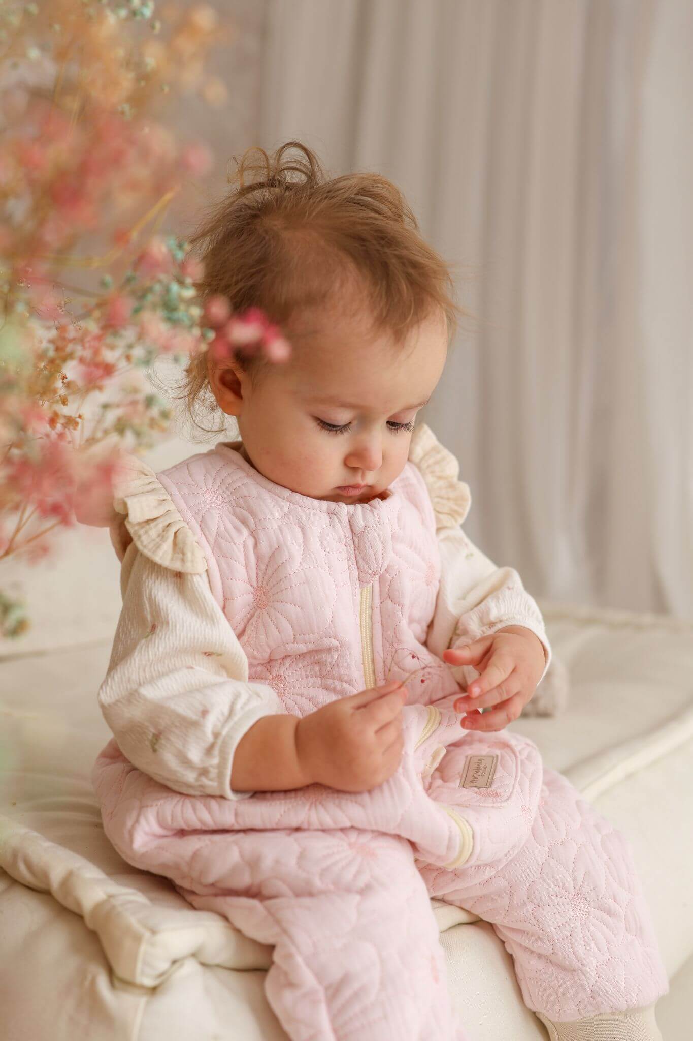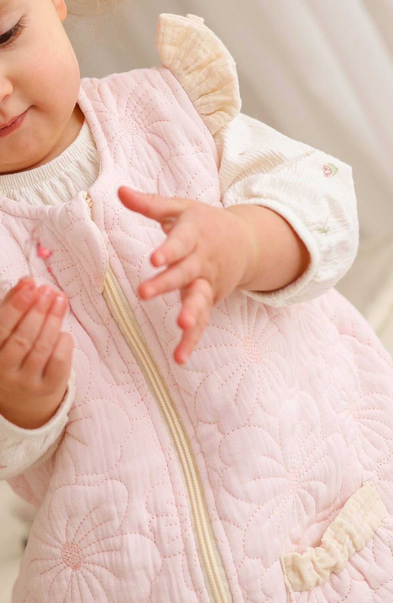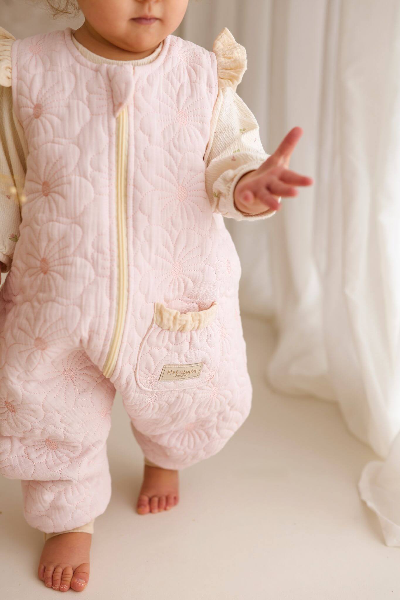 Śpiworek z nogawkami muślinowy do spania pikowane kwiatuszki pudrowy róż